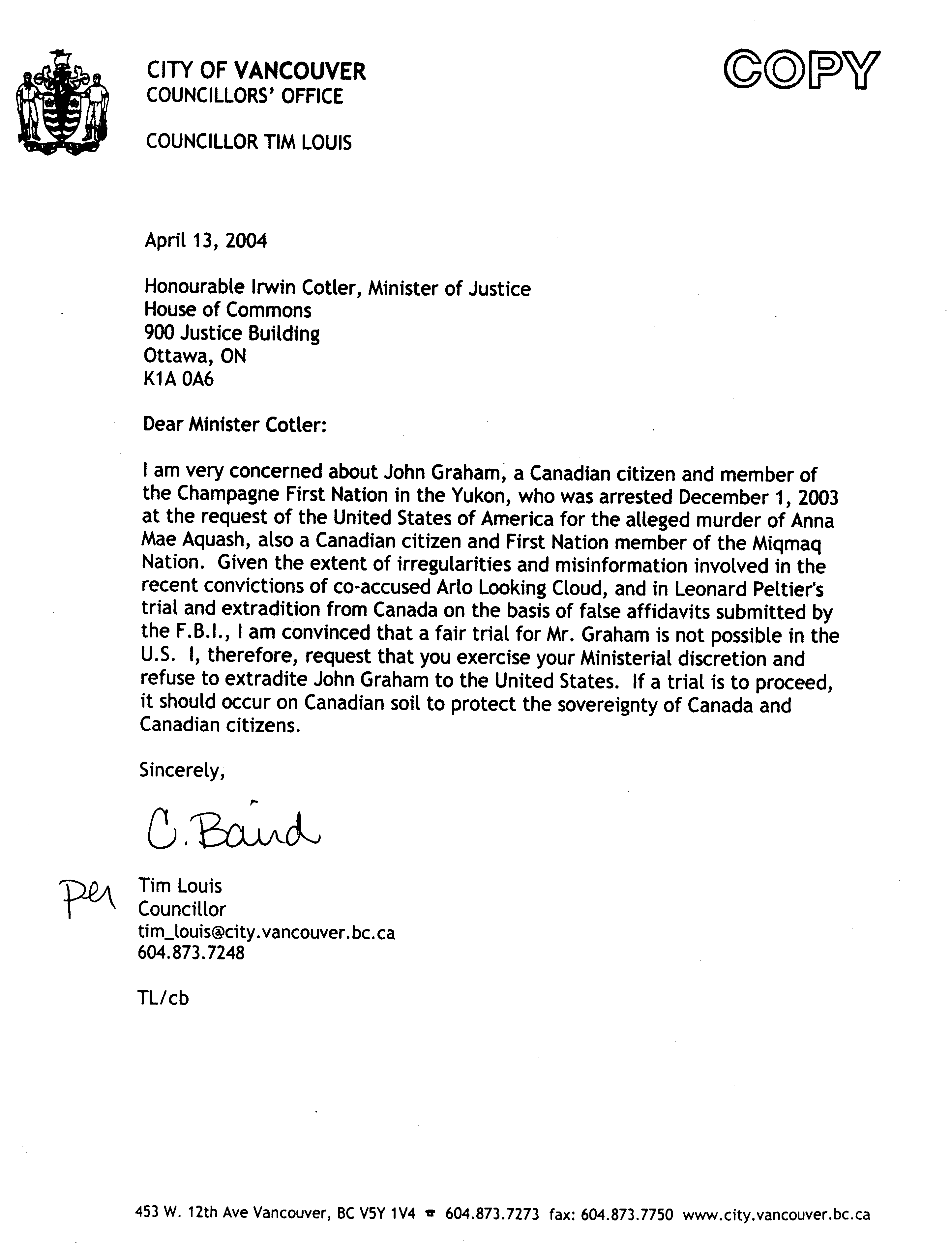 April 13, 2004 Honourable Irwin Cotler, Dear Minister Cotler: I am very concerned about John Graham, a Canadian citizen and member of the Champagne First Nation in the Yukon, who was arrested December 1, 2003 at the request of the United States of America for the alleged murder of Anna Mae Aquash, also a Canadian citizen and First Nation member of the Miqmaq Nation. Given the extent of irregularities and misinformation involved in the recent convictions of co-accused Arlo Looking Cloud, and in Leonard Peltier's trial and extradition from Canada on the basis of false affidavits submitted by the F.B.I., I am convinced that a fair trial for Mr. Graham is not possible in the U.S. I therefore, request that you exercise your Ministerial discretion and refuse to extradite John Graham to the United States. If a trial is to proceed, it should occur on Canadian soil to protect the sovereignty of Canada and Canadian citizens. Sincerely, 453 W. 12th Ave, Vancouver, BC V5Y 1V4